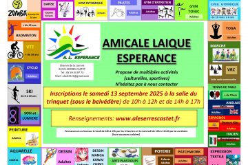 Ne ratez pas les inscriptions! Rendez-vous à la salle du Trinquet (sous le Belvédère) le samedi 13 septembre de 10h à 12h et de 14h à 17h.. Pour certaines activités les inscriptions ont lieu dans des salles différentes: Yoga: salle CASTET Peinture /dessin : salle de peinture Danse: salle de l’Amicale